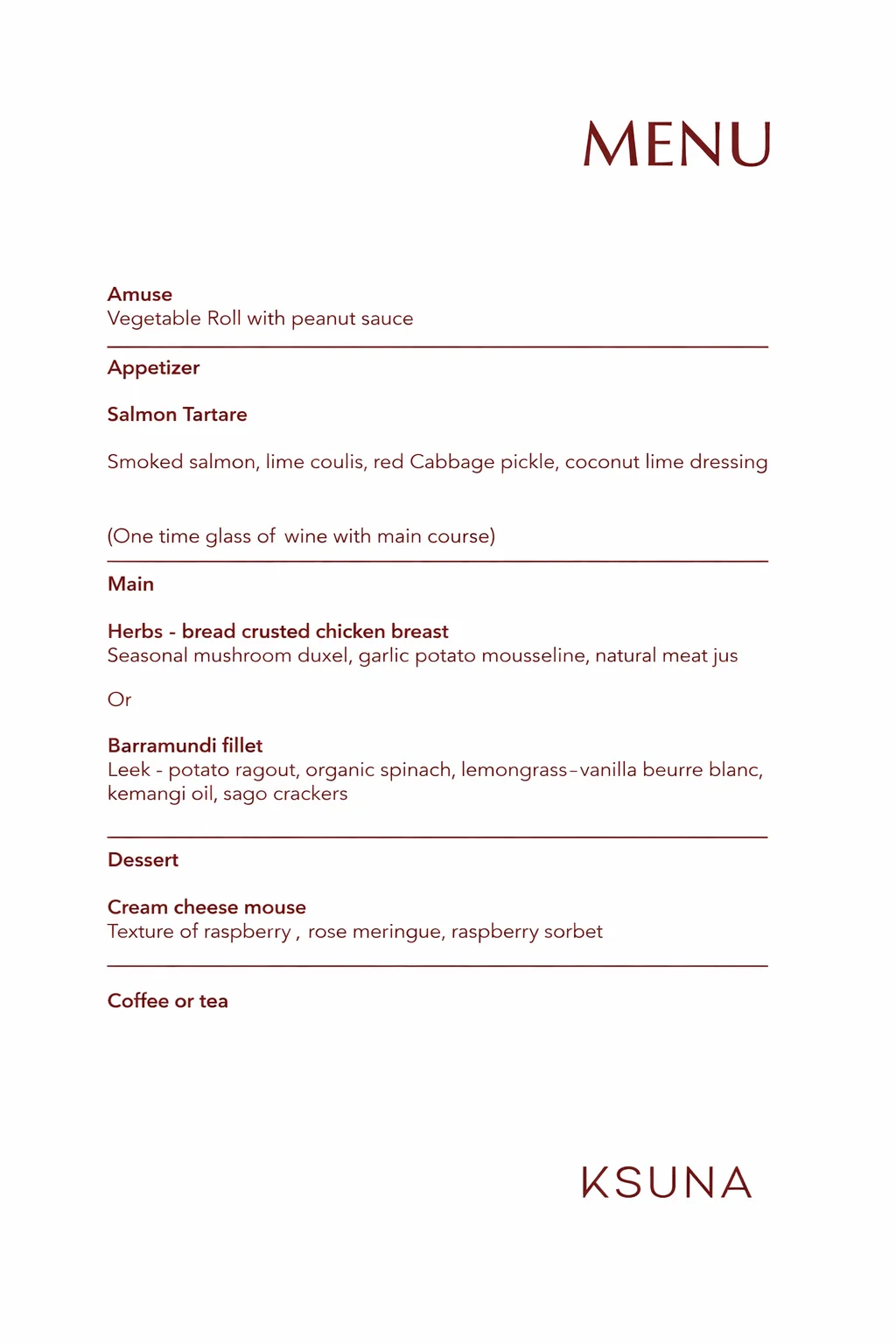 Ksuna Restaurant celebrates the essence of Bali through a thoughtfully curated menu that showcases the island’s authenticity alongside global culinary inspirations. Using the finest locally sourced ingredients, each dish is prepared with an emphasis on freshness, creativity, and refined presentation. Ksuna Restaurant is an exceptional dining experience that harmoniously blends Balinese authenticity with modern international flavors. With a menu curated from the finest locally sourced ingredients, every dish is crafted to celebrate freshness, seasonality, and artistry.